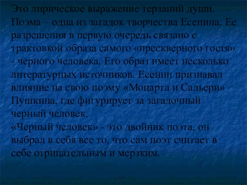 Есенина. Ее разрешения в первую очередь связано с трактовкой образа самого «прескверного гостя» - черного человека. Его образ имеет несколько литературных источников. Есенин признавал влияние на свою поэму «Моцарта и Сальери» Пушкина, где фигурирует за загадочный черный человек.
