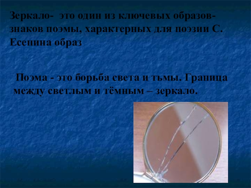Поэма - это борьба света и тьмы. Граница между светлым и тёмным – зеркало.