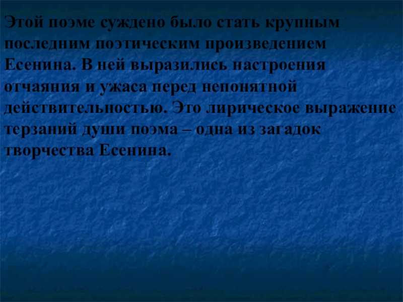 Слайд 97Этой поэме суждено было стать крупным последним поэтическим произведением Есенина. В