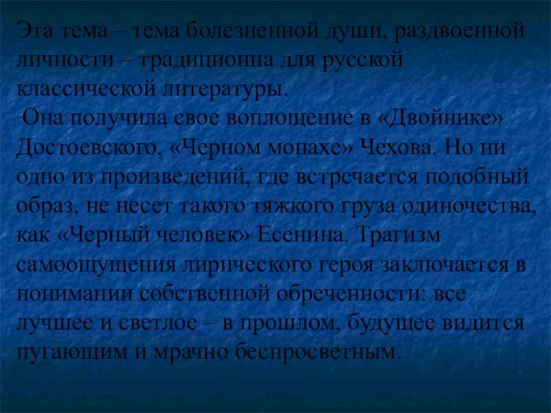 Она получила свое воплощение в «Двойнике» Достоевского, «Черном монахе» Чехова. Но ни одно из произведений, где встречается подобный образ, не несет такого тяжкого груза одиночества, как «Черный человек» Есенина. Трагизм самоощущения лирического героя заключается в понимании собственной обреченности: все лучшее и светлое – в прошлом, будущее видится пугающим и мрачно беспросветным.