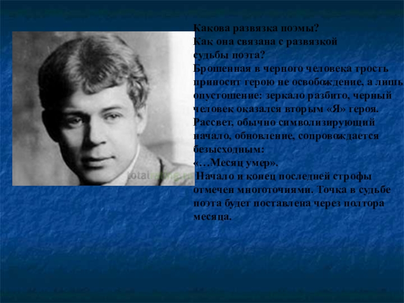 его личный враг, он враг всего прекрасного, враг человека. Он олицетворяет чёрные силы, живущие в каждом. И именно в этом чёрный человек Есенина близок пушкинскому образу.Начало и конец последней строфы отмечен многоточиями. Точка в судьбе поэта будет поставлена через 1,5 месяца. До сих пор не пришли исследователи к единому мнению о гибели поэта.