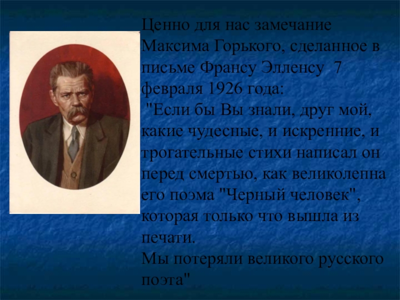 "Если бы Вы знали, друг мой, какие чудесные, и искренние, и трогательные стихи написал он перед смертью, как великолепна его поэма "Черный человек", которая только что вышла из печати.