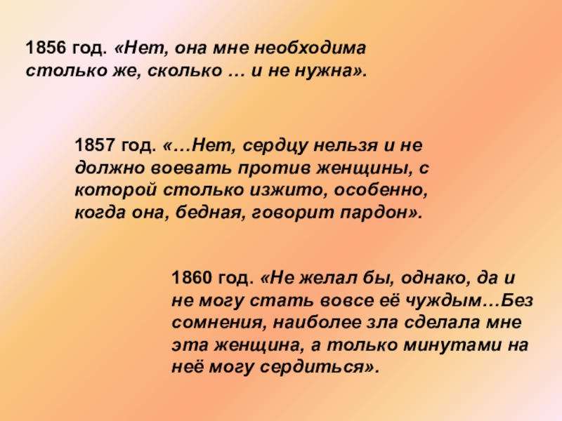 1860 год. «Не желал бы, однако, да и не могу стать вовсе её чуждым…Без сомнения, наиболее зла сделала мне эта женщина, а только минутами на неё могу сердиться».