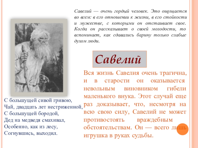 Вся жизнь Савелия очень трагична, и в старости он оказывается невольным виновником гибели маленького внука. Этот случай еще раз доказывает, что, несмотря на всю свою силу, Савелий не может противостоять враждебным обстоятельствам. Он — всего лишь игрушка в руках судьбы.