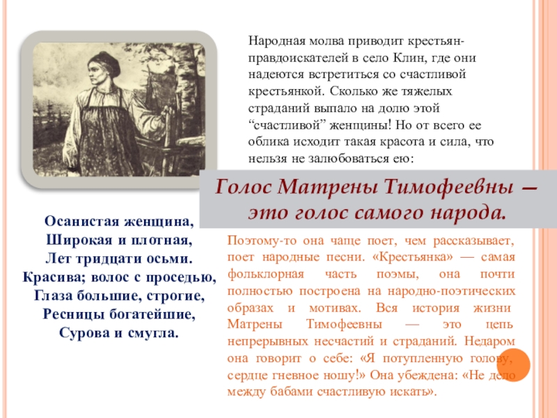 Поэтому-то она чаще поет, чем рассказывает, поет народные песни. «Крестьянка» — самая фольклорная часть поэмы, она почти полностью построена на народно-поэтических образах и мотивах. Вся история жизни Матрены Тимофеевны — это цепь непрерывных несчастий и страданий. Недаром она говорит о себе: «Я потупленную голову, сердце гневное ношу!» Она убеждена: «Не дело между бабами счастливую искать».