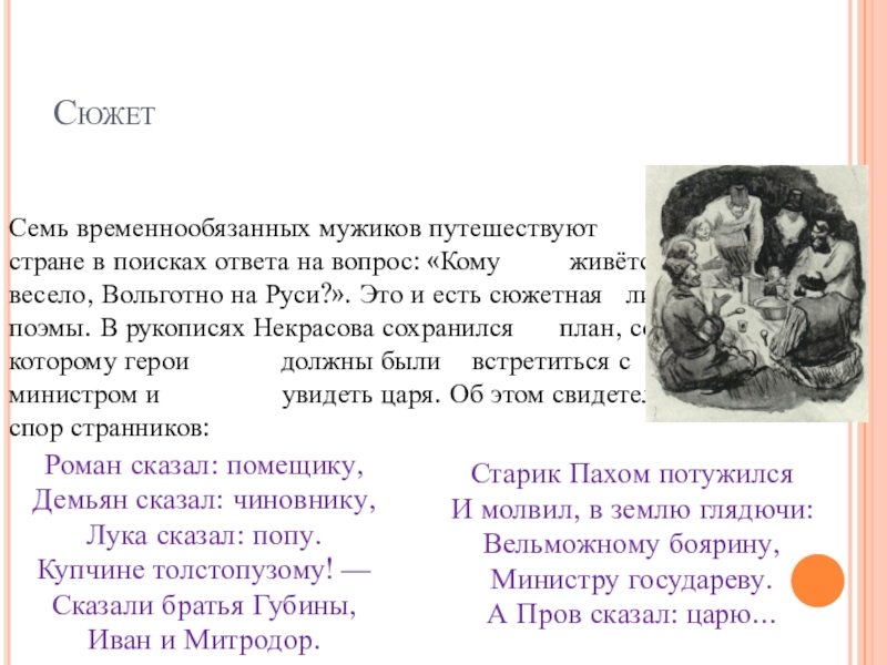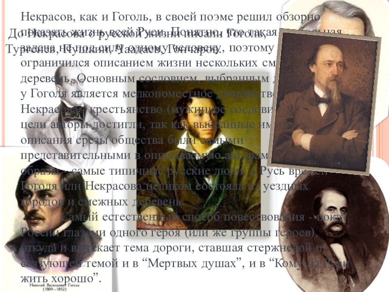 Некрасов, как и Гоголь, в своей поэме решил обзорно показать жизнь всей Руси. Понятно, что такая глобальная задача не под силу одному человеку, поэтому Некрасов ограничился описанием жизни нескольких смежных деревень. Основным сословием, выбранным для описания, у Гоголя является мелкопоместное дворянство, а у Некрасова - крестьянство (мужицкое сословие). Своей цели авторы достигли, так как выбранные ими для описания срезы общества были самыми представительными в описываемую авторами эпоху. Эти образы - самые типичные русские люди, а Русь времен Гоголя или Некрасова целиком состояла из уездных городов и смежных деревень.