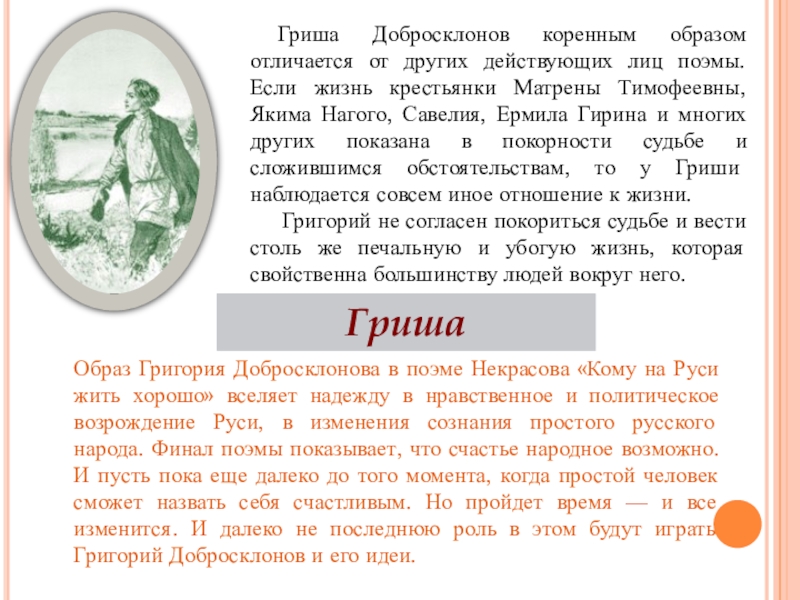 Образ Григория Добросклонова в поэме Некрасова «Кому на Руси жить хорошо» вселяет надежду в нравственное и политическое возрождение Руси, в изменения сознания простого русского народа. Финал поэмы показывает, что счастье народное возможно. И пусть пока еще далеко до того момента, когда простой человек сможет назвать себя счастливым. Но пройдет время — и все изменится. И далеко не последнюю роль в этом будут играть Григорий Добросклонов и его идеи.