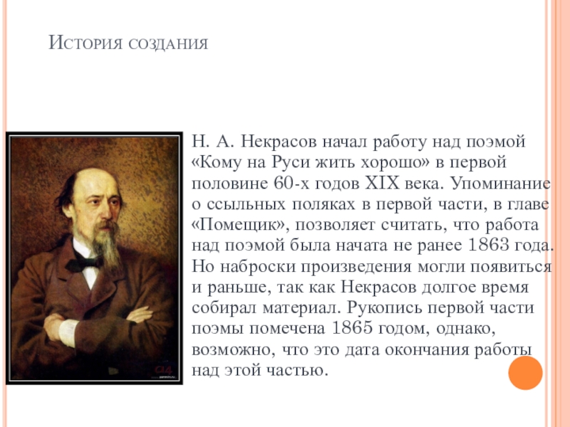 К продолжению работы над поэмой писатель приступил лишь в 1870-х, написав ещё три части произведения: «Последыш» (1872 год), «Крестьянка» (1873 год), «Пир — на весь мир» (1876 год). Поэт не собирался ограничиваться написанными главами, задумывались ещё три или четыре части. Однако развивающаяся болезнь помешала задумкам автора. Некрасов, чувствуя приближение смерти, постарался придать некоторую «законченность» последней части, «Пир — на весь мир».