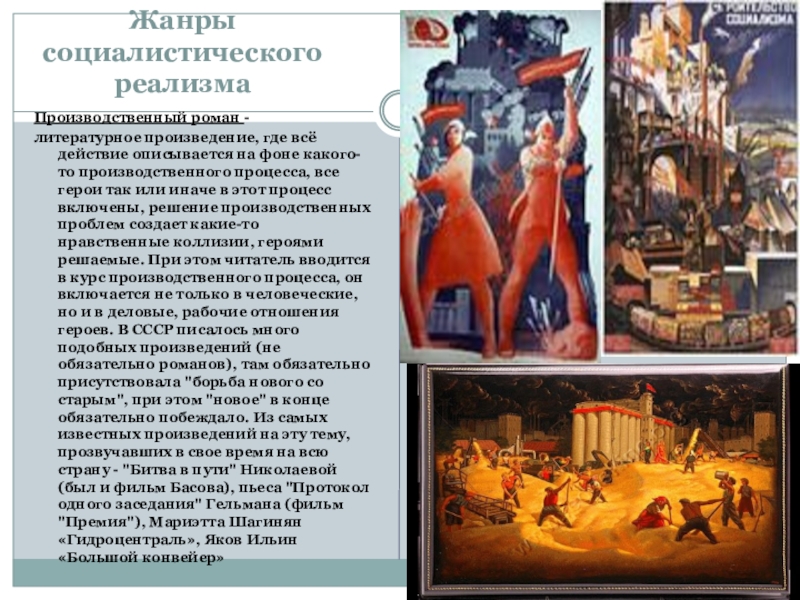 на фоне какого-то производственного процесса, все герои так или иначе в этот процесс включены, решение производственных проблем создает какие-то нравственные коллизии, героями решаемые. При этом читатель вводится в курс производственного процесса, он включается не только в человеческие, но и в деловые, рабочие отношения героев. В СССР писалось много подобных произведений (не обязательно романов), там обязательно присутствовала "борьба нового со старым", при этом "новое" в конце обязательно побеждало. Из самых известных произведений на эту тему, прозвучавших в свое время на всю страну - "Битва в пути" Николаевой (был и фильм Басова), пьеса "Протокол одного заседания" Гельмана (фильм "Премия"), Мариэтта Шагинян «Гидроцентраль», Яков Ильин «Большой конвейер»