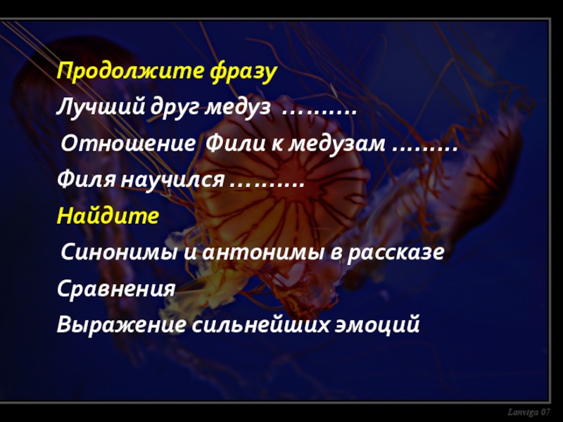 Продолжите фразуЛучший друг медуз  …....... Отношение  Фили к медузам .........Филя научился ….......Найдите Синонимы и антонимы в рассказеСравненияВыражение сильнейших эмоций