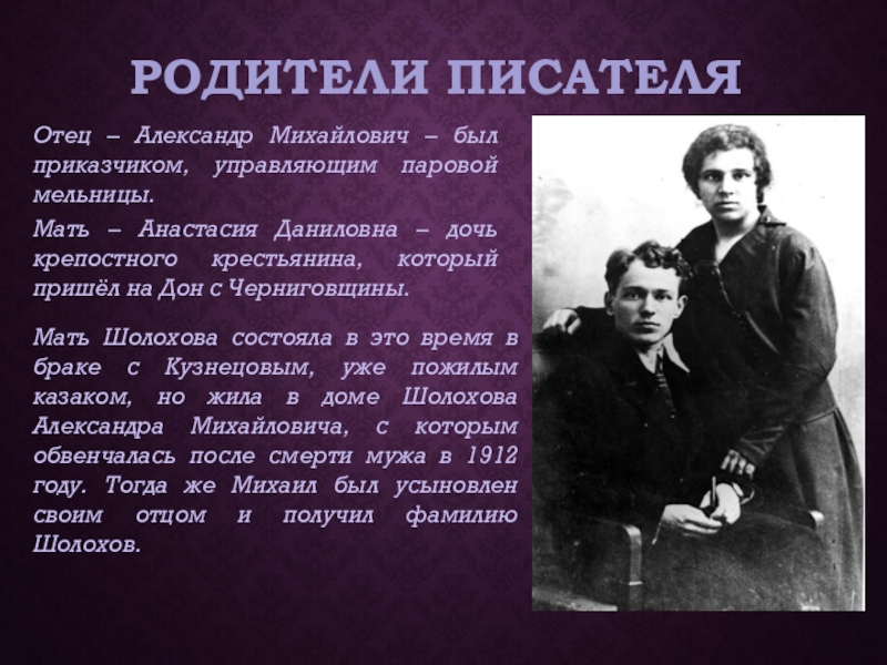 Мать Шолохова состояла в это время в браке с Кузнецовым, уже пожилым казаком, но жила в доме Шолохова Александра Михайловича, с которым обвенчалась после смерти мужа в 1912 году. Тогда же Михаил был усыновлен своим отцом и получил фамилию Шолохов.