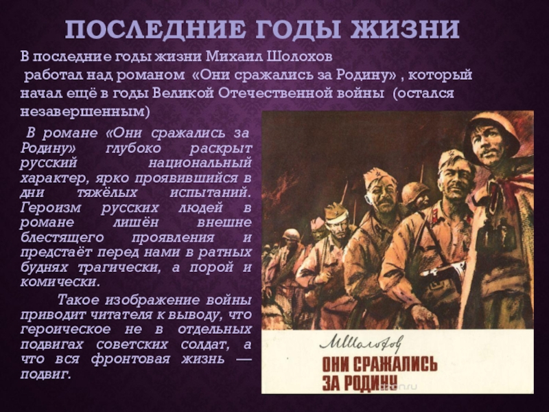 Такое изображение войны приводит читателя к выводу, что героическое не в отдельных подвигах советских солдат, а что вся фронтовая жизнь — подвиг.