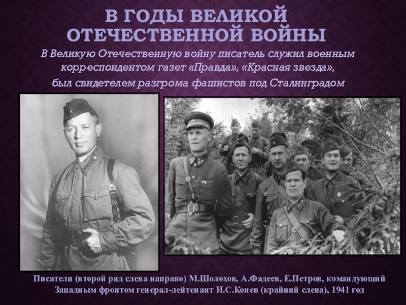 Писатели (второй ряд слева направо) М.Шолохов, А.Фадеев, Е.Петров, командующий Западным фронтом генерал-лейтенант И.С.Конев (крайний слева), 1941 год
