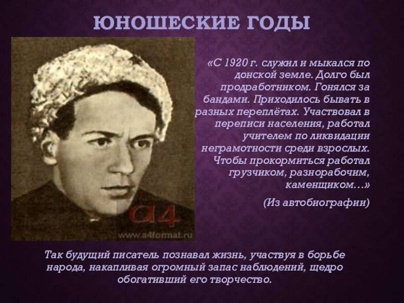 Так будущий писатель познавал жизнь, участвуя в борьбе народа, накапливая огромный запас наблюдений, щедро обогативший его творчество.