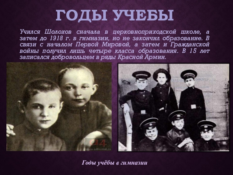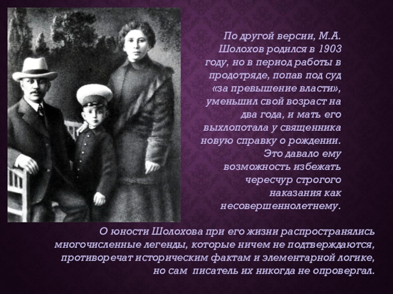 О юности Шолохова при его жизни распространялись многочисленные легенды, которые ничем не подтверждаются, противоречат историческим фактам и элементарной логике, но сам писатель их никогда не опровергал.