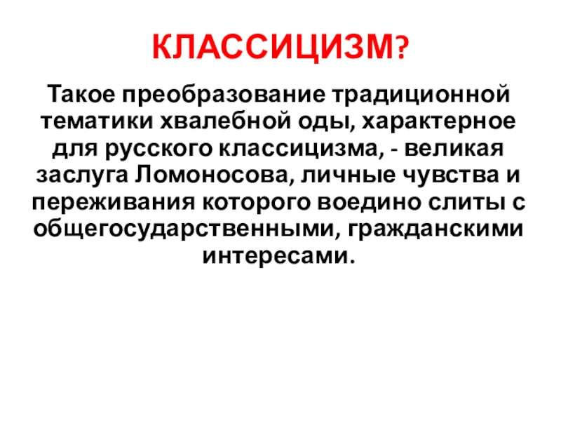Такое преобразование традиционной тематики хвалебной оды, характерное для русского классицизма, -
