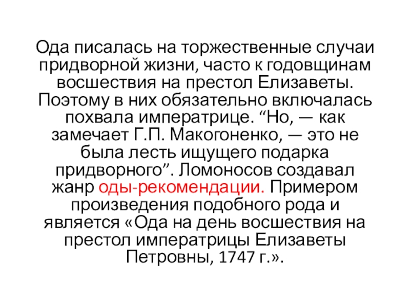на престол Елизаветы. Поэтому в них обязательно включалась похвала императрице. “Но, — как замечает Г.П. Макогоненко, — это не была лесть ищущего подарка придворного”. Ломоносов создавал жанр оды-рекомендации. Примером произведения подобного рода и является «Ода на день восшествия на престол императрицы Елизаветы Петровны, 1747 г.».