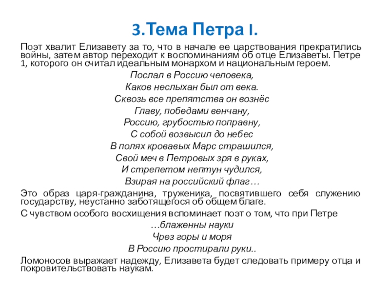 Мир – условие процветания государства и необходимая предпосылка для успехов просвещения. Петр 1 для Ломоносова – национальный герой, прославившийся победами на суше и на море, осознавший необходимость развития науки и просвещения.