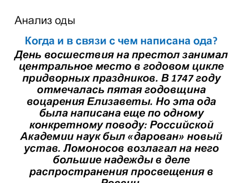 престол занимал центральное место в годовом цикле придворных праздников. В 1747 году отмечалась пятая годовщина воцарения Елизаветы. Но эта ода была написана еще по одному конкретному поводу: Российской Академии наук был «дарован» новый устав. Ломоносов возлагал на него большие надежды в деле распространения просвещения в России.