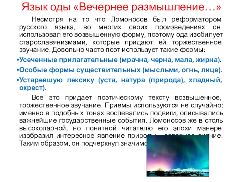 Все это придает поэтическому тексту возвышенное, торжественное звучание. Приемы используются не случайно: именно в подобных тонах воспевались подвиги, описывались важнейшие государственные события. Ломоносов же в столь высокопарной, но понятной читателю его эпохи манере изобразил интересное явление природы - северное сияние. Таким образом, он подчеркнул значимость науки.