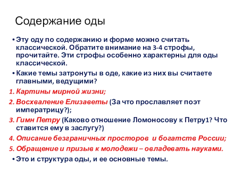 Несмотря на то что ода сочинялась в связи с каким-нибудь официальным событием – военной победой, очередной годовщиной вступления на престол царствующей особы и т.п., Ломоносов всегда находил возможность говорить о том, что его волновало, что было особенно важным для России.