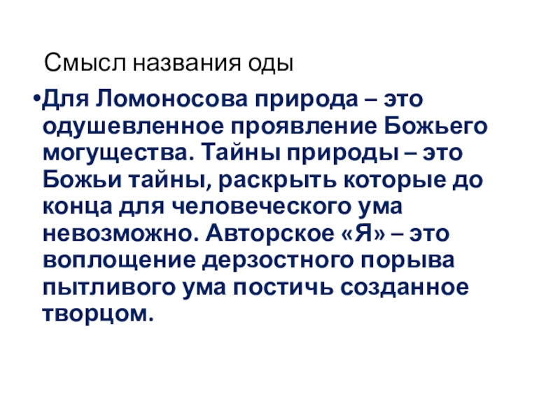 (Бог выступает здесь как создатель и организатор мироздания, бесконечно богатого в великих и малых проявлениях, связанных неразрывно друг с другом в общей гармонии, в “стройном чине”. Но преклонение перед величием Творца не порабощает поэта, он охвачен стремлением познать природу. Его восхищает многообразие природы. Более того, коль “просветлённая лампада возжжена”, то это ко многому должно подвигнуть человека.)