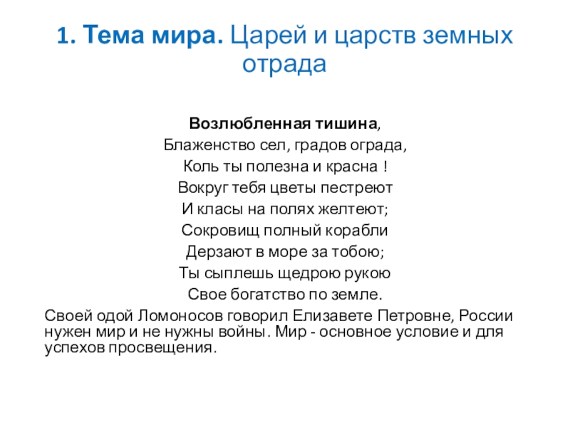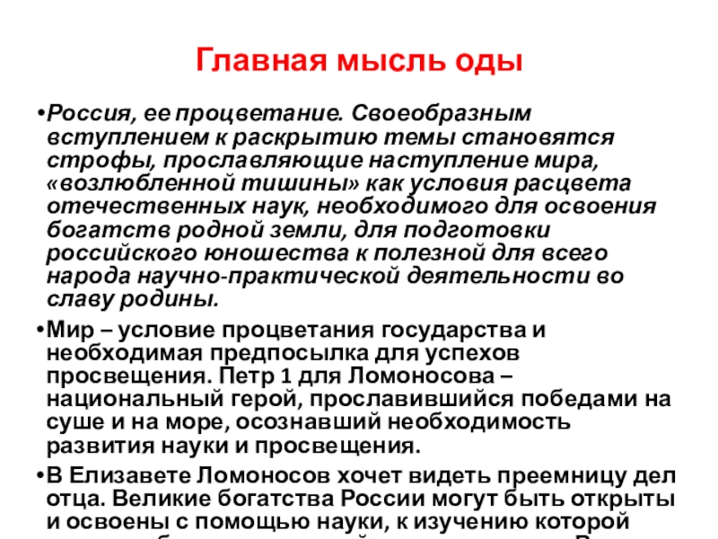 Своей одой Ломоносов говорил Елизавете Петровне, России нужен мир и не нужны войны. Мир - основное условие и для успехов просвещения.