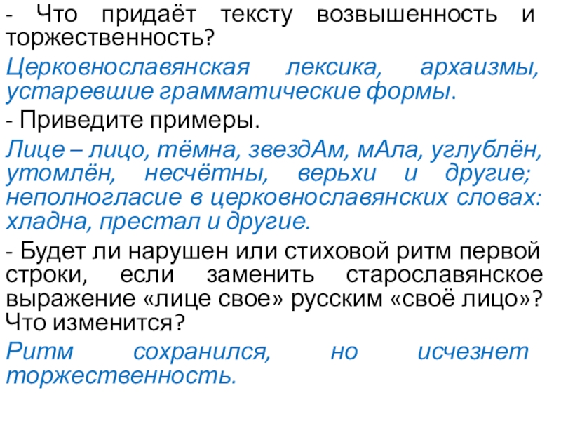 Слайд 11- Что придаёт тексту возвышенность и торжественность?