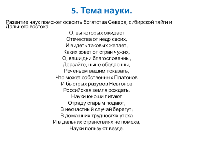 строфы, прославляющие наступление мира, «возлюбленной тишины» как условия расцвета отечественных наук, необходимого для освоения богатств родной земли, для подготовки российского юношества к полезной для всего народа научно-практической деятельности во славу родины.