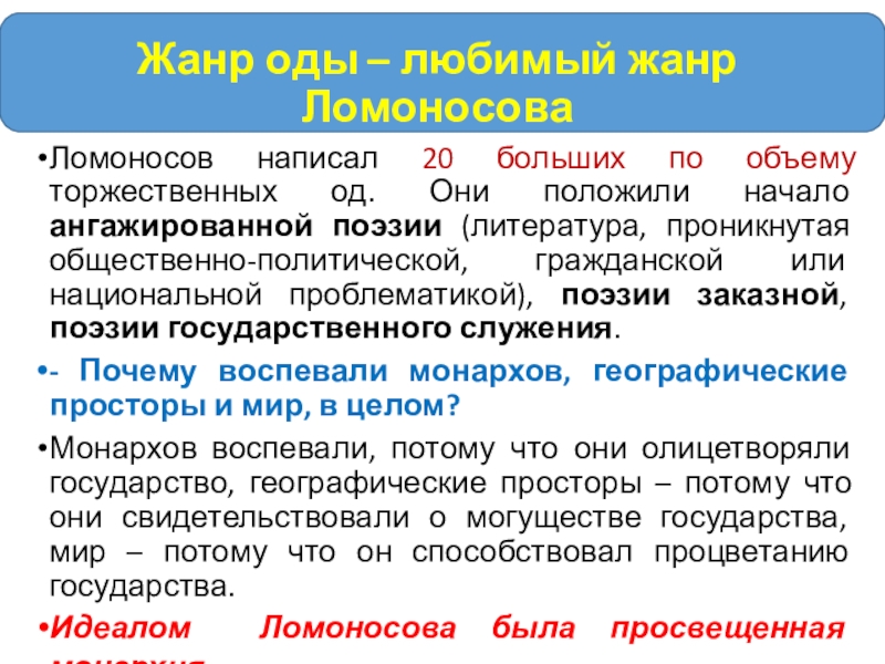 торжественных од. Они положили начало ангажированной поэзии (литература, проникнутая общественно-политической, гражданской или национальной проблематикой), поэзии заказной, поэзии государственного служения.