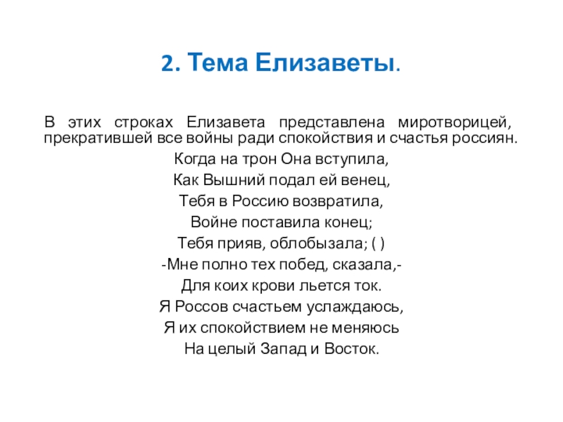 В этих строках Елизавета представлена миротворицей, прекратившей все