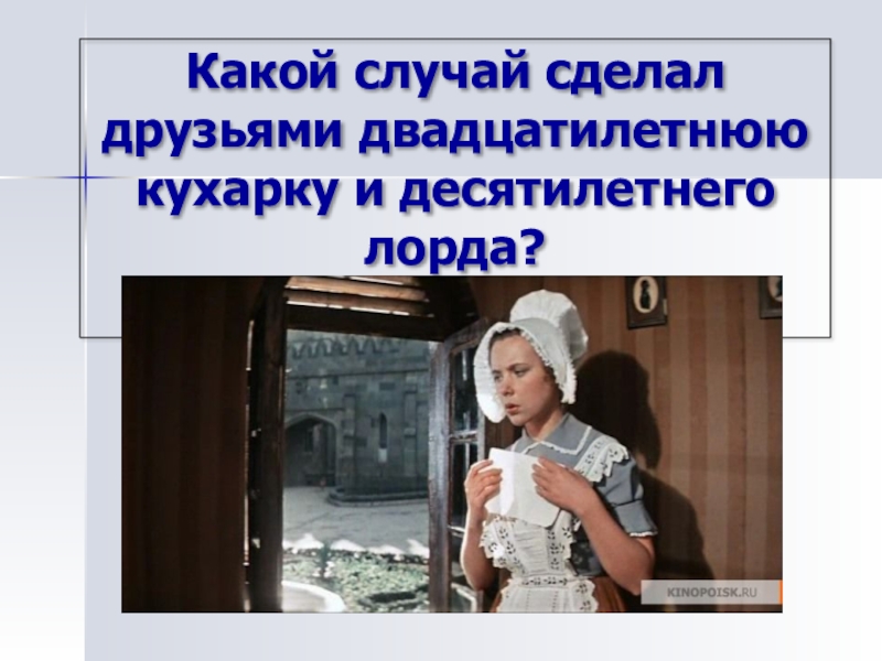 Слайд 9Какой случай сделал друзьями двадцатилетнюю кухарку и десятилетнего лорда?
