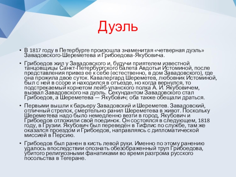 Грибоедов был ранен в кисть левой руки. Именно по этому ранению удалось впоследствии опознать обезображенный труп Грибоедова, убитого религиозными фанатиками во время разгрома русского посольства в Тегеране.