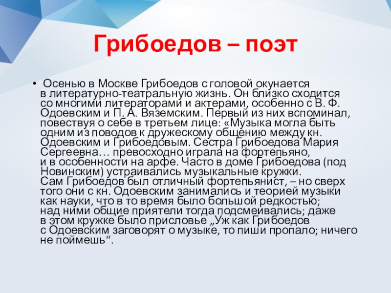 со многими литераторами и актерами, особенно с В. Ф. Одоевским и П. А. Вяземским. Первый из них вспоминал, повествуя о себе в третьем лице: «Музыка могла быть одним из поводов к дружескому общению между кн. Одоевским и Грибоедовым. Сестра Грибоедова Мария Сергеевна… превосходно играла на фортепьяно, и в особенности на арфе. Часто в доме Грибоедова (под Новинским) устраивались музыкальные кружки. Сам Грибоедов был отличный фортепьянист, – но сверх того они с кн. Одоевским занимались и теорией музыки как науки, что в то время было большой редкостью; над ними общие приятели тогда подсмеивались; даже в этом кружке было присловье „Уж как Грибоедов с Одоевским заговорят о музыке, то пиши пропало; ничего не поймешь“.