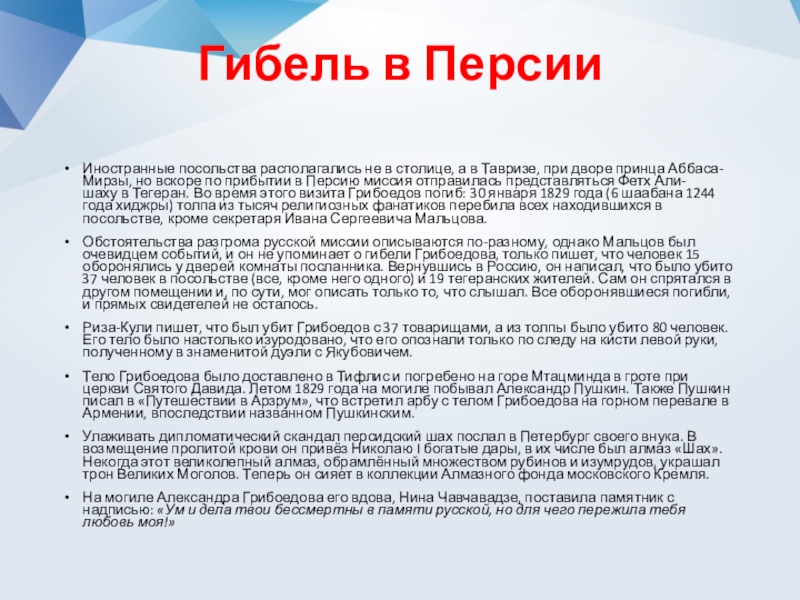 дворе принца Аббаса-Мирзы, но вскоре по прибытии в Персию миссия отправилась представляться Фетх Али-шаху в Тегеран. Во время этого визита Грибоедов погиб: 30 января 1829 года (6 шаабана 1244 года хиджры) толпа из тысяч религиозных фанатиков перебила всех находившихся в посольстве, кроме секретаря Ивана Сергеевича Мальцова.