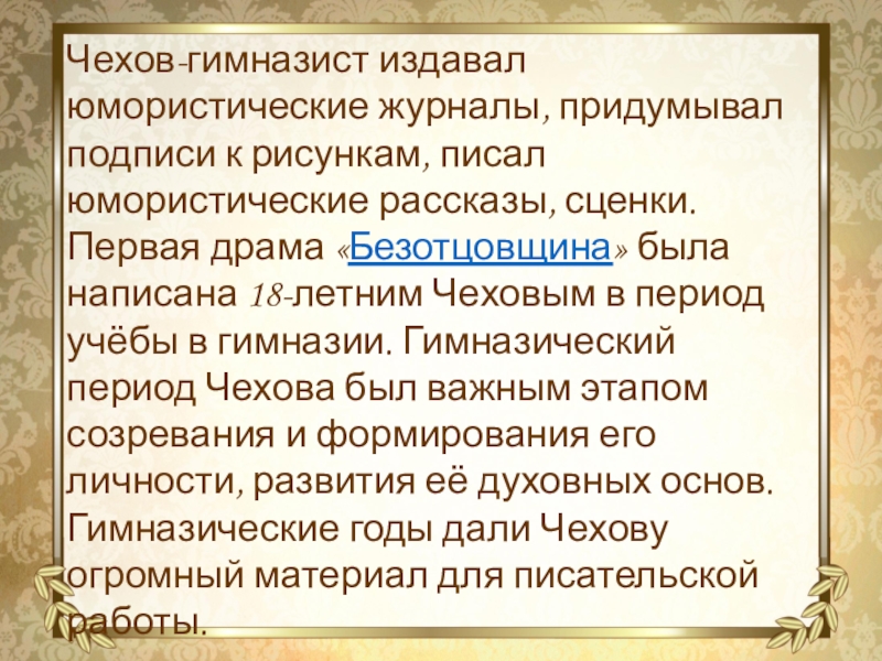 сценки. Первая драма «Безотцовщина» была написана 18-летним Чеховым в период учёбы в гимназии. Гимназический период Чехова был важным этапом созревания и формирования его личности, развития её духовных основ. Гимназические годы дали Чехову огромный материал для писательской работы.