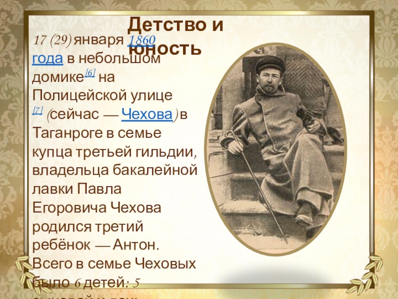 в Таганроге в семье купца третьей гильдии, владельца бакалейной лавки Павла Егоровича Чехова родился третий ребёнок — Антон. Всего в семье Чеховых было 6 детей: 5 сыновей и дочь