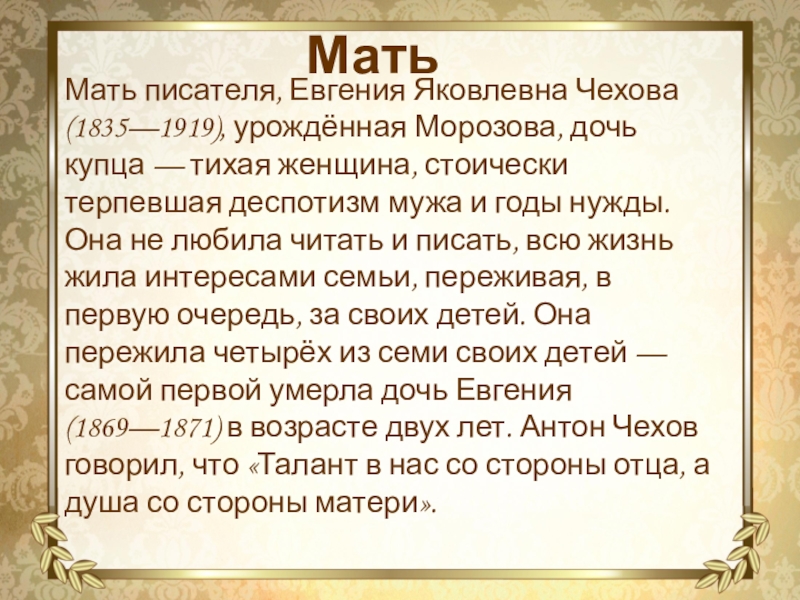 Мать писателя, Евгения Яковлевна Чехова (1835—1919), урождённая Морозова, дочь купца —