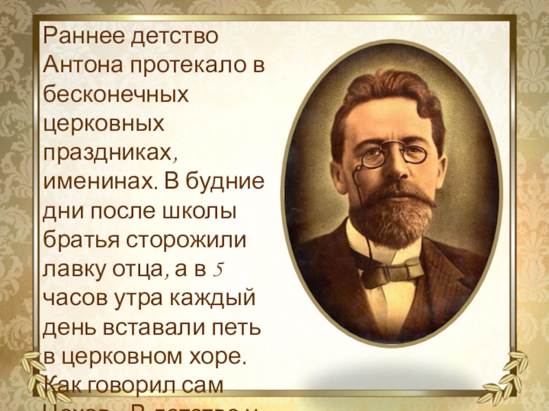 после школы братья сторожили лавку отца, а в 5 часов утра каждый день вставали петь в церковном хоре. Как говорил сам Чехов: «В детстве у меня не было детства».