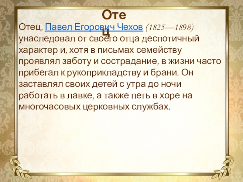 Отец, Павел Егорович Чехов (1825—1898) унаследовал от своего отца деспотичный характер и, хотя