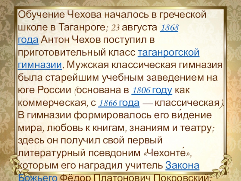 Чехов поступил в приготовительный класс таганрогской гимназии. Мужская классическая гимназия была старейшим учебным заведением на юге России (основана в 1806 году как коммерческая, с 1866 года — классическая). В гимназии формировалось его ви́дение мира, любовь к книгам, знаниям и театру; здесь он получил свой первый литературный псевдоним «Чехонте́», которым его наградил учитель Закона Божьего Фёдор Платонович Покровский; здесь начались его первые литературные и сценические опыты.