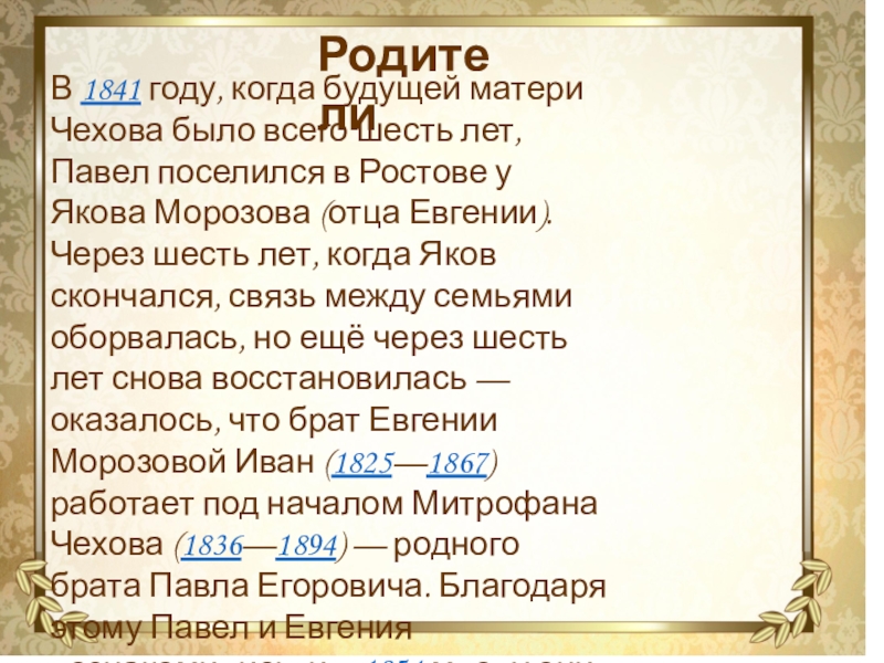 в Ростове у Якова Морозова (отца Евгении). Через шесть лет, когда Яков скончался, связь между семьями оборвалась, но ещё через шесть лет снова восстановилась — оказалось, что брат Евгении Морозовой Иван (1825—1867) работает под началом Митрофана Чехова (1836—1894) — родного брата Павла Егоровича. Благодаря этому Павел и Евгения познакомились, и в 1854-м году они обвенчались.