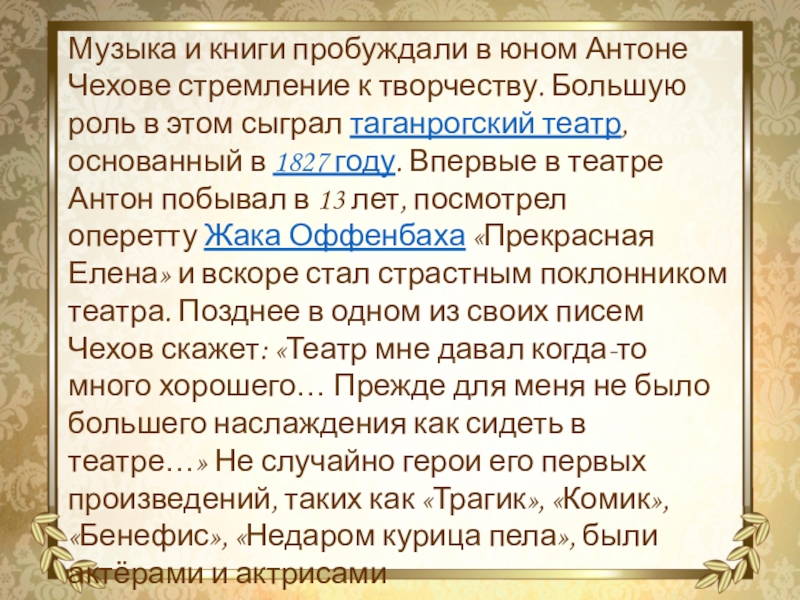 Большую роль в этом сыграл таганрогский театр, основанный в 1827 году. Впервые в театре Антон побывал в 13 лет, посмотрел оперетту Жака Оффенбаха «Прекрасная Елена» и вскоре стал страстным поклонником театра. Позднее в одном из своих писем Чехов скажет: «Театр мне давал когда-то много хорошего… Прежде для меня не было большего наслаждения как сидеть в театре…» Не случайно герои его первых произведений, таких как «Трагик», «Комик», «Бенефис», «Недаром курица пела», были актёрами и актрисами