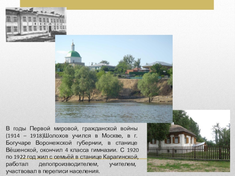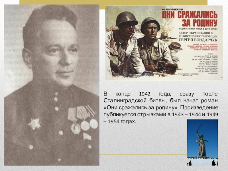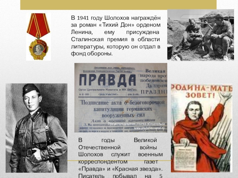 В годы Великой Отечественной войны Шолохов служит военным корреспондентом газет «Правда» и «Красная звезда». Писатель побывал на 5 фронтах.
