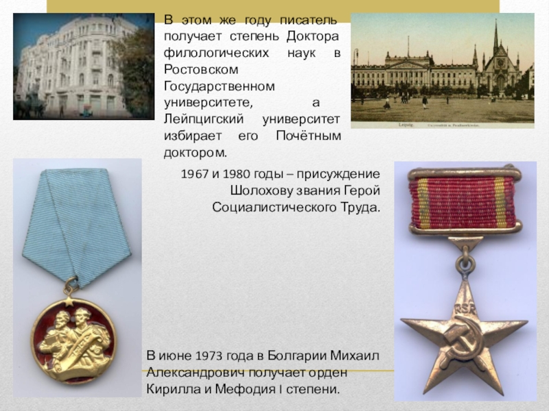 1967 и 1980 годы – присуждение Шолохову звания Герой Социалистического Труда.