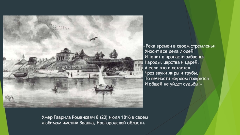 Умер Гаврила Романович 8 (20) июля 1816 в своем любимом имении Званка, Новгородской области.