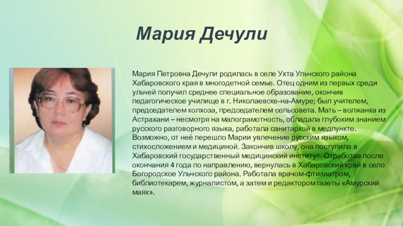 Мария Петровна Дечули родилась в селе Ухта Ульчского района Хабаровского