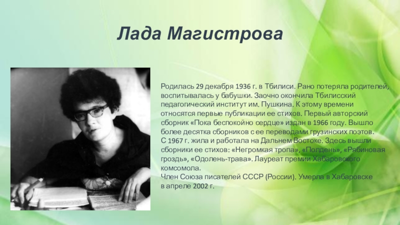Тбилисский педагогический институт им. Пушкина. К этому времени относятся первые публикации ее стихов. Первый авторский сборник «Пока беспокойно сердце» издан в 1966 году. Вышло более десятка сборников с ее переводами грузинских поэтов. С 1967 г. жила и работала на Дальнем Востоке. Здесь вышли сборники ее стихов: «Негромкая тропа», «Полдень», «Рябиновая гроздь», «Одолень-трава». Лауреат премии Хабаровского комсомола.