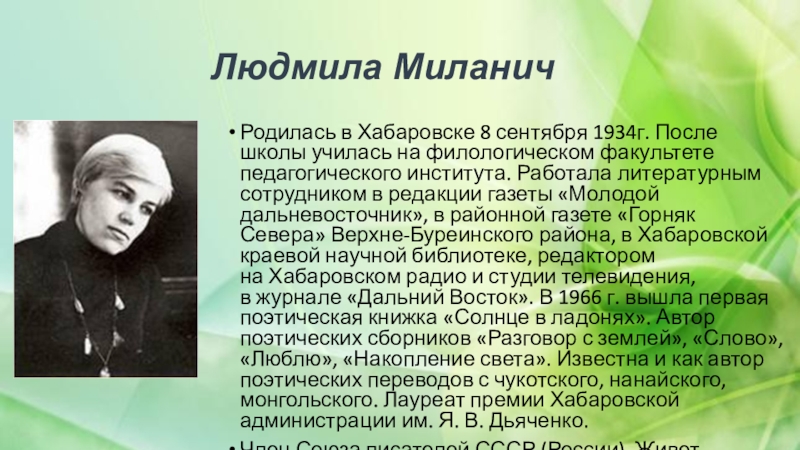 Родилась в Хабаровске 8 сентября 1934г. После школы училась на филологическом факультете педагогического