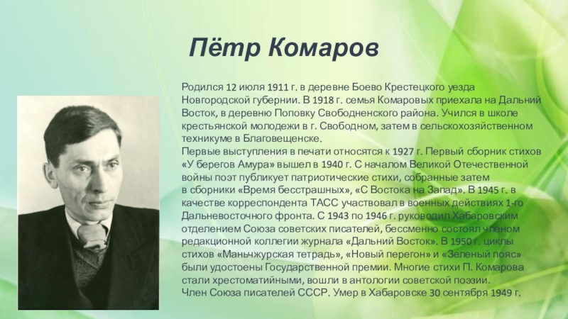 Член Союза писателей СССР. Умер в Хабаровске 30 сентября 1949 г.